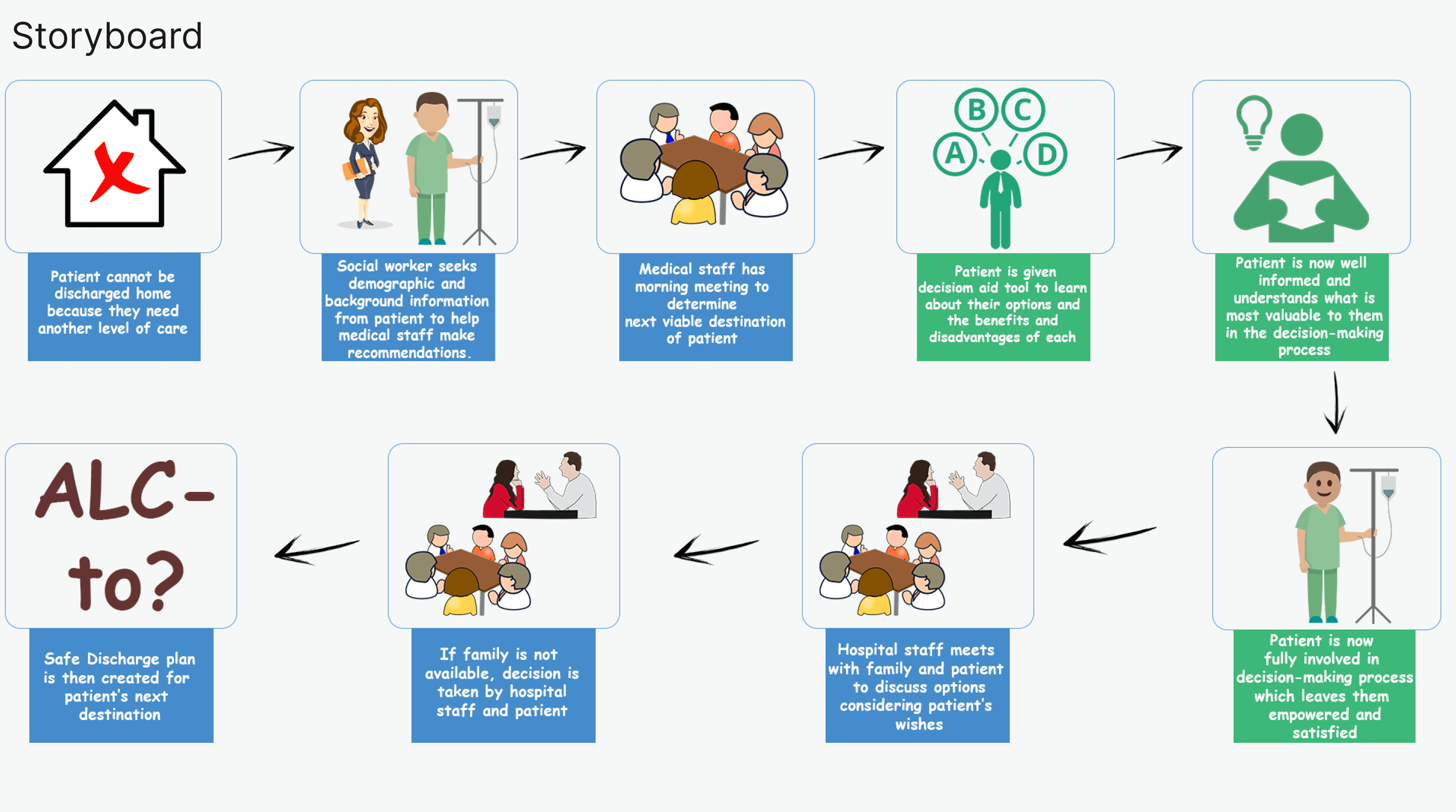 In our research prior to the inception, we realized that the recommended decisions taken about the next discharge destination of patients do not include the patient from the start. The patient is only somewhat involved at the tail end of the process. This led to patients' choices mostly not considered if it conflicted with the hospital’s recommendations, and subsequently slowed down the decision making process, which in turn led to slow processing times and unavailablity of hospital beds for incoming patients. At the project's inception, our objective was to analyze the movement of ALC (Alternative Level of Care) patients within the hospital, utilizing this data to guide decision-making and enhance patient flow. However, the arrival of the COVID-19 pandemic significantly restricted our interaction with the hospital. As designers, we confronted the challenge of adapting our approach while addressing the same underlying issue. This led us to uncover a bottleneck in the decision-making process, prompting us to explore alternative solutions.
