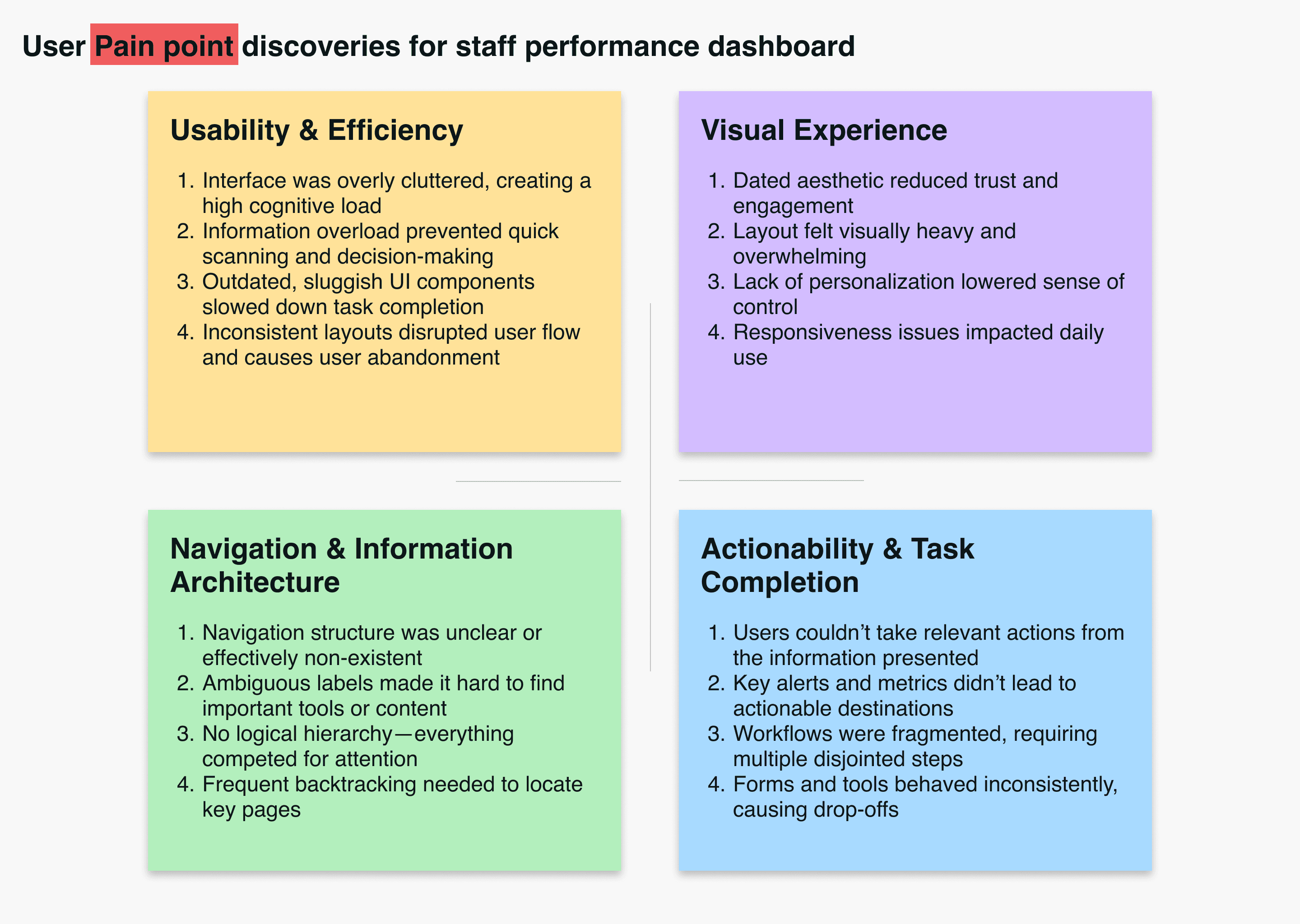 The original dashboard tried to show everything at once, which made priority tasks hard to spot. Legacy patterns, mixed styles and competing elements created visual noise, and newer staff often felt lost because the interface lacked hierarchy. The experience worked, but it demanded more effort than it should.